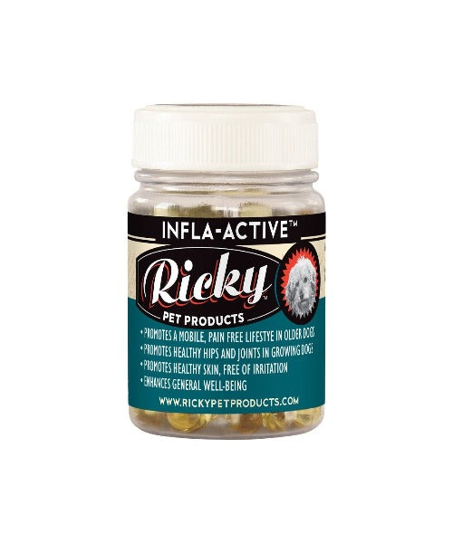 Ricky Infla-Active Capsules (90) has buchu Oil and salmon oil soft gel caps for easy absorption Rich in a host of bioflavonoids and vitamins. It promotes relief in arthritis and hip dysplasia, promotes relief in post-surgical rehabilitation and is a mobile, pain-free lifestyle in older dogs. Ricky Infla-Active Capsules (90) promotes healthy hips and joints in growing dogs and may be taken long term with no side effects. It is rich in a host of bioflavonoids, antioxidants and vitamins and not meal dependent.