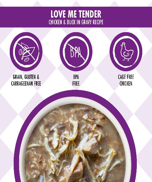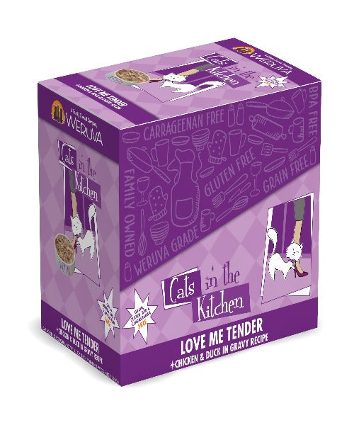 Weruva Love Me Tender recipe contains Chicken & Duck in Gravy Recipe. The kitchen is so often the heart of the home. Love Me Tender is so sweet, your cat will love it so. Shredded chicken and duck meat gives kitty a happy glow!
