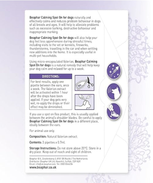 Does your pup struggle with excessive barking, howling separation anxiety, vet visits, fireworks or thunderstorm stress? Then the Beaphar Dog Calming Spot On might be the ideal solution for you!