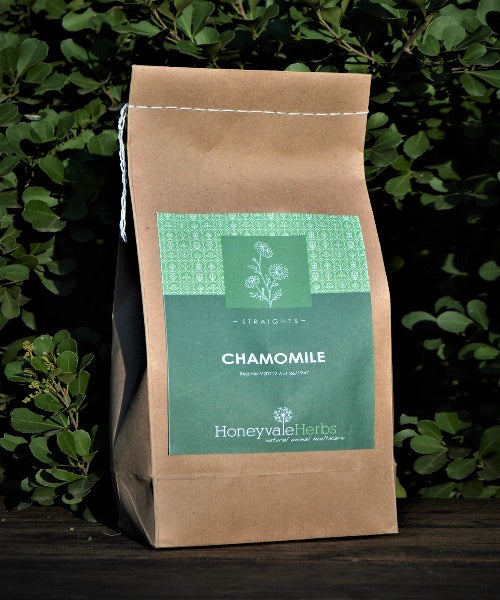 Honeyvale Chamomile 500g for Horses is an excellent nervine for horses who process their nervousness through their digestive system, making it useful for treating horses with stress-related gastric ulcers. When competing or trucking, a "Chamomile" horse usually "gets the runs" (or any other stressful time when the horse senses it is going into an unknown situation e.g. hacking in a new area). It is, however, useful for all "types" of tense horses because it is a mild sedative. Chamomile has anti-inflammatory, analgesic, and anti-spasmodic properties. It has numerous advantages and can help with relaxation and calming. It possesses anti-inflammatory properties. As an aid in the treatment of digestive disorders, May aid in the prevention and relief of scouring caused by excessive excitability. As an anti-bacterial and to provide symptomatic relief for skin and respiratory allergies.