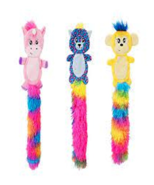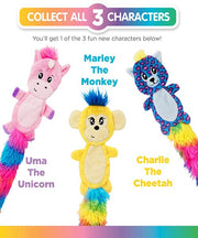 The Outward Hound Surprise Tails Assorted Dog Toy can be unboxed to reveal 1 of 3 surprise Tail Animal dog toys inside that your dog can pull on for added fun. They are floppy and made of crincle materiel to intrigue your canine pal. Collect all of the Tails to unbox, chew, toss and play! The boxes feature Uma the Unicorn, Charlie the Cheetah or Marley the Monkey.