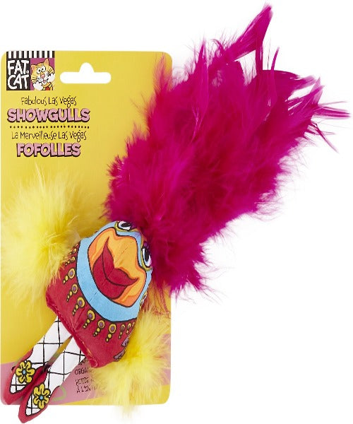 The Fat Cat Classic Showgulls Cat Toy is all about the glitz and glam and kittens can't get enough of the shimmy shake of their tail feathers. Your cat will beg for a repeat performance! Have fun with the show! The world-famous Zoom Around the Room organic catnip is included to tempt your cat. There's a lot of feathery fun to be had, so why not gather them all? Keeps your cat guessing and delighted with this fun interactive cat toy.