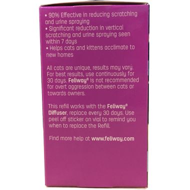 Use the diffuser in the room where your cat spends the most time. Plug the diffuser in an electric socket with a minimum clear distance above the diffuser of 5 ft. (The vapor carrying the FELIWAY messages rises in a column of warm air above the diffuser). One diffuser covers up to 700 sq. ft. You may need to use more than one diffuser for a large or multi-floor home. Be sure to replace your diffuser every 6 months and refill vials every 4 weeks. It is recommended to replace the refill every 4 weeks, even if a small amount of liquid remains in the vial (the vial will never be completely empty).