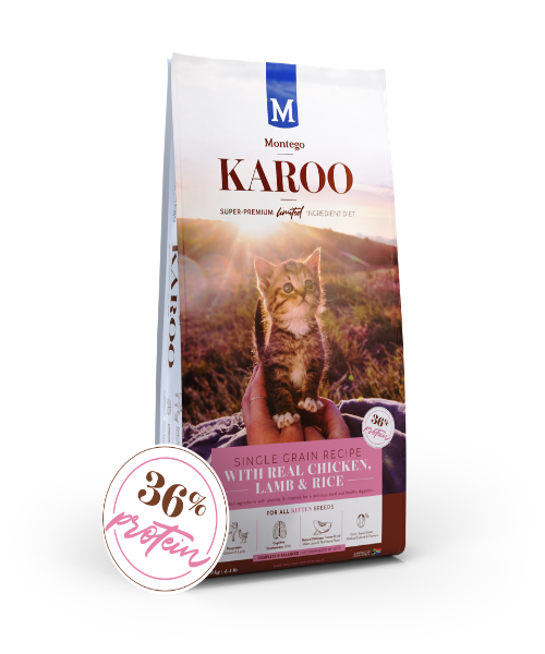 At the peak of physical development, adult cats require nutrition that enhances their physique and feeds their minds, while keeping them healthy and active. Scientifically formulated and nutrient-rich, Montego Karoo Adult’s super-premium, limited ingredient recipe provides adult cats of all breeds and sizes with an optimally balanced diet.