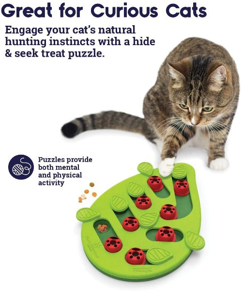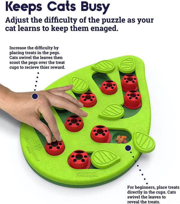Your smarty cats will love the challenge of the Buggin' Out Puzzle & Play by Nina Ottosson. Cats bat at the pegs and swivel the leaves to uncover the 14 hidden treat compartments. Adjust the difficulty of the puzzle to make it easier for beginners or more challenging for super smarty cats. Feed your cat from the puzzle to engage their hunting and foraging instincts; the puzzle holds up to 1/4th cup of food.