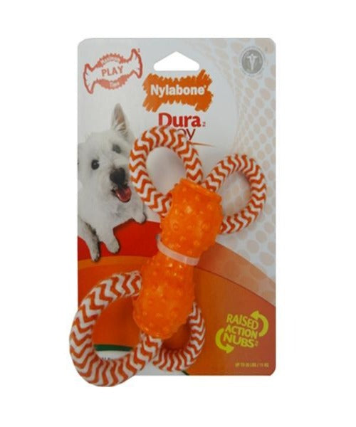 The Nylabone Play Rope Quad Dog Toy is made of robust, durable nylon and features massage nubs and cotton rope for extra stimulation. Raised bristles form as a result of chewing, which serve to keep teeth clean and minimize plaque and tartar buildup. It is ideal for dogs up to 11kg.