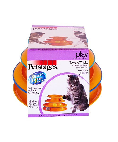 3X THE FUN: Get kitty ready for 3 levels of ball spinning fun with the Petstages Tower of Tracks cat track toy.