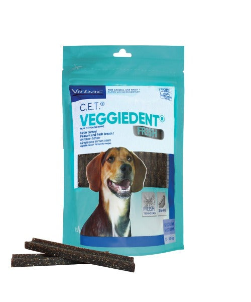 The Virbac CET Veggiedent Fr3sh Dental Dog Chews offer a healthy solution in removing plaque and tartar and help to keep your pet’s breath It will significantly improve your dog’s breath from Day 1 for a full 24 hours, as well as continued breath improvement over a 2 week period. It contains new Fr3sh technology that is designed to target the causes of halitosis in dogs where it cleanses, cools and addresses digestive causes of bad breath.